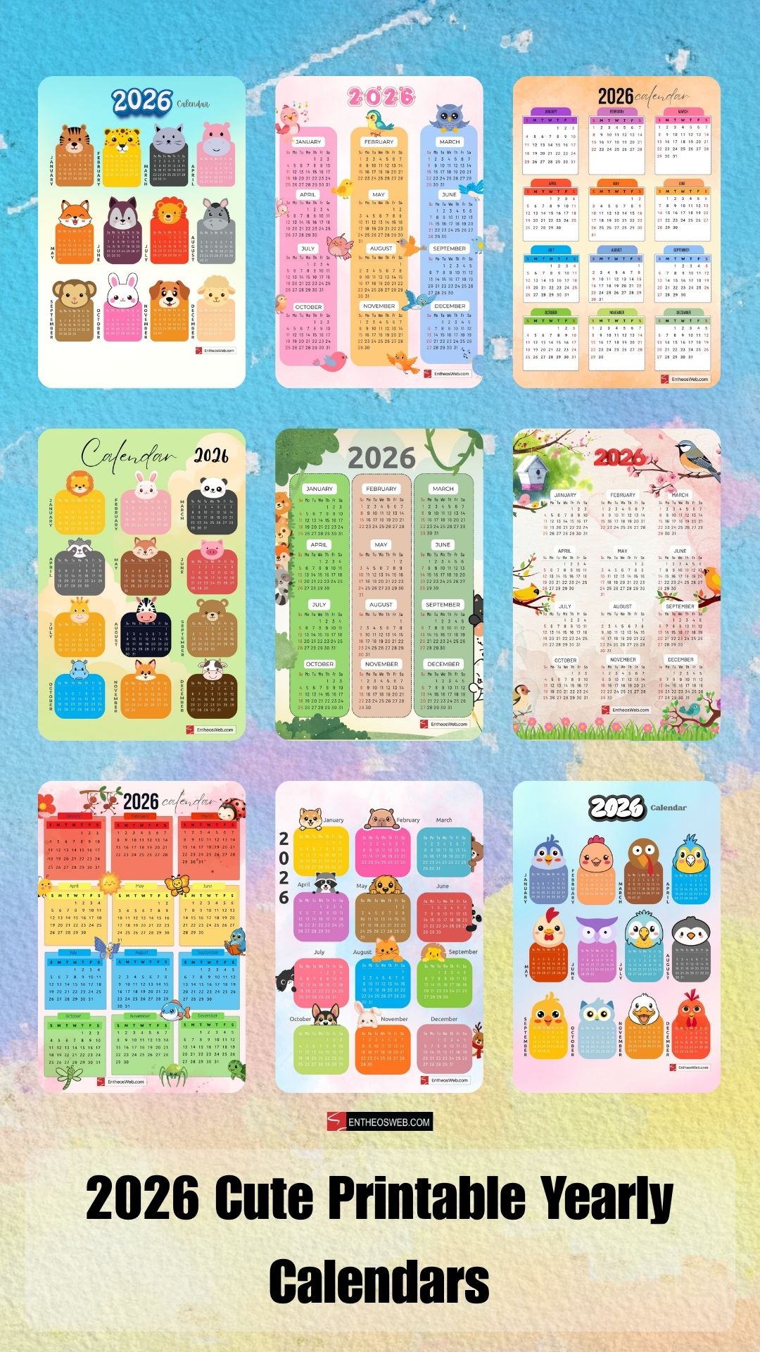 Download cute 2026 printable yearly calendars featuring adorable animals and colorful birds. These full year printabale 2026 calendars can be used in preschools and classrooms and add a touch of fun and color. Perfect for kids these fun printable calendars for kids make staying organized both easy and delightful.