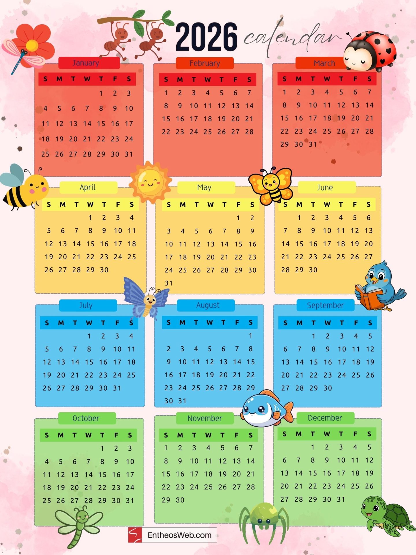 Colorful 2026 printable yearly calendar featuring cute ants, ladybirds, butterflies, honey bees, flowers, and birds.