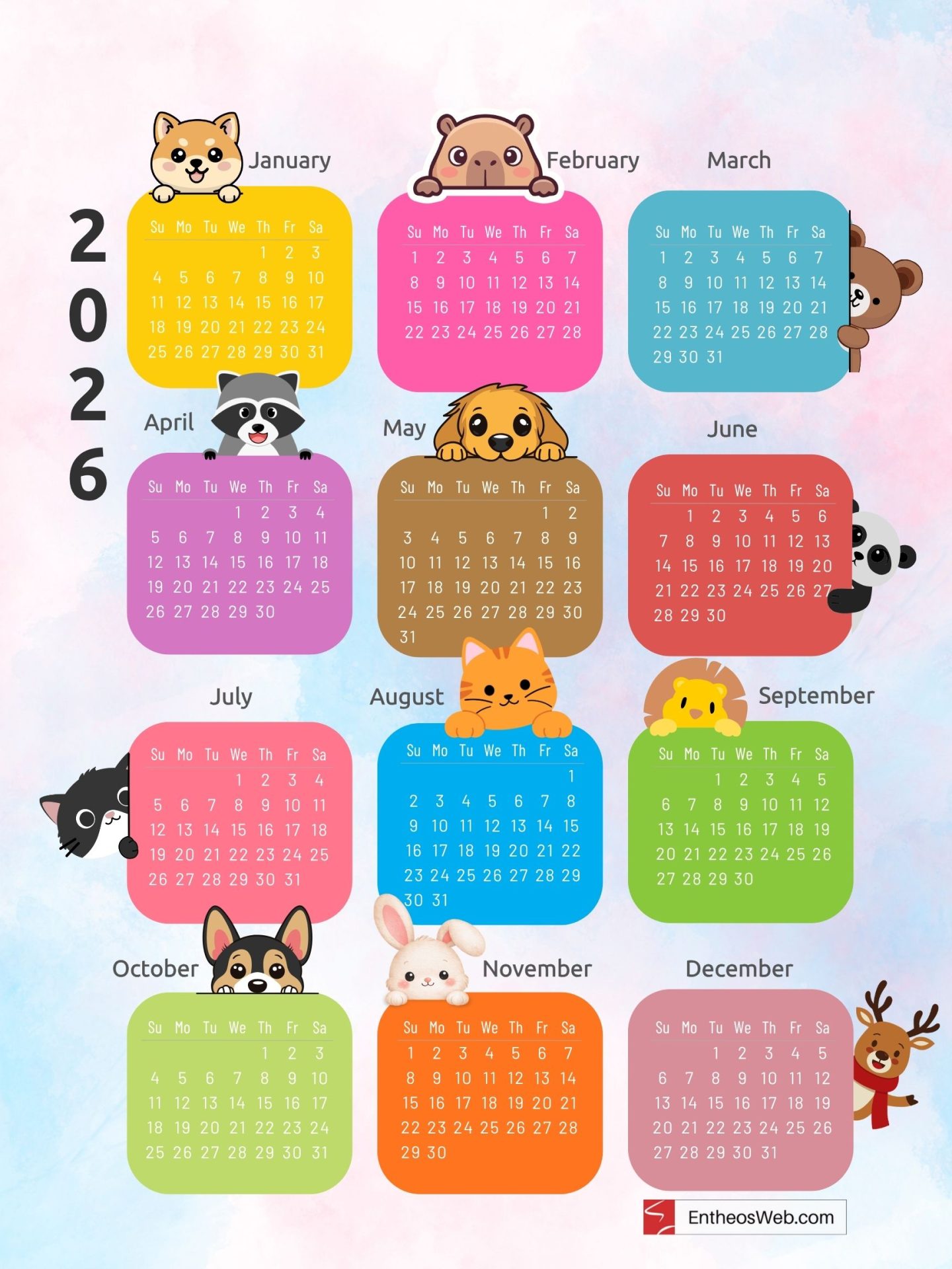 Cute Cartoon Animals 2026 Printable Yearly Calendar