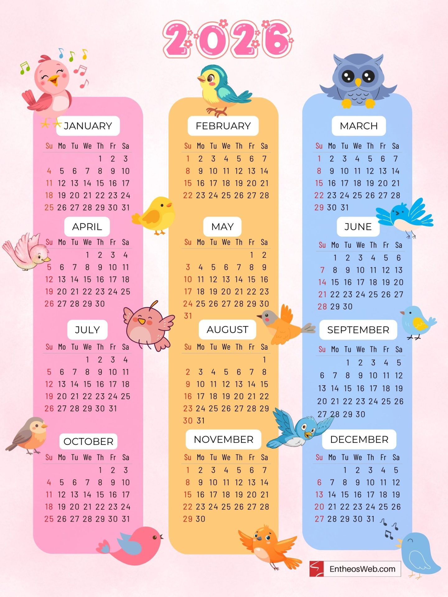 Cute Pink, Yellow and Blue Color Birds 2026 Printable Yearly Calendar