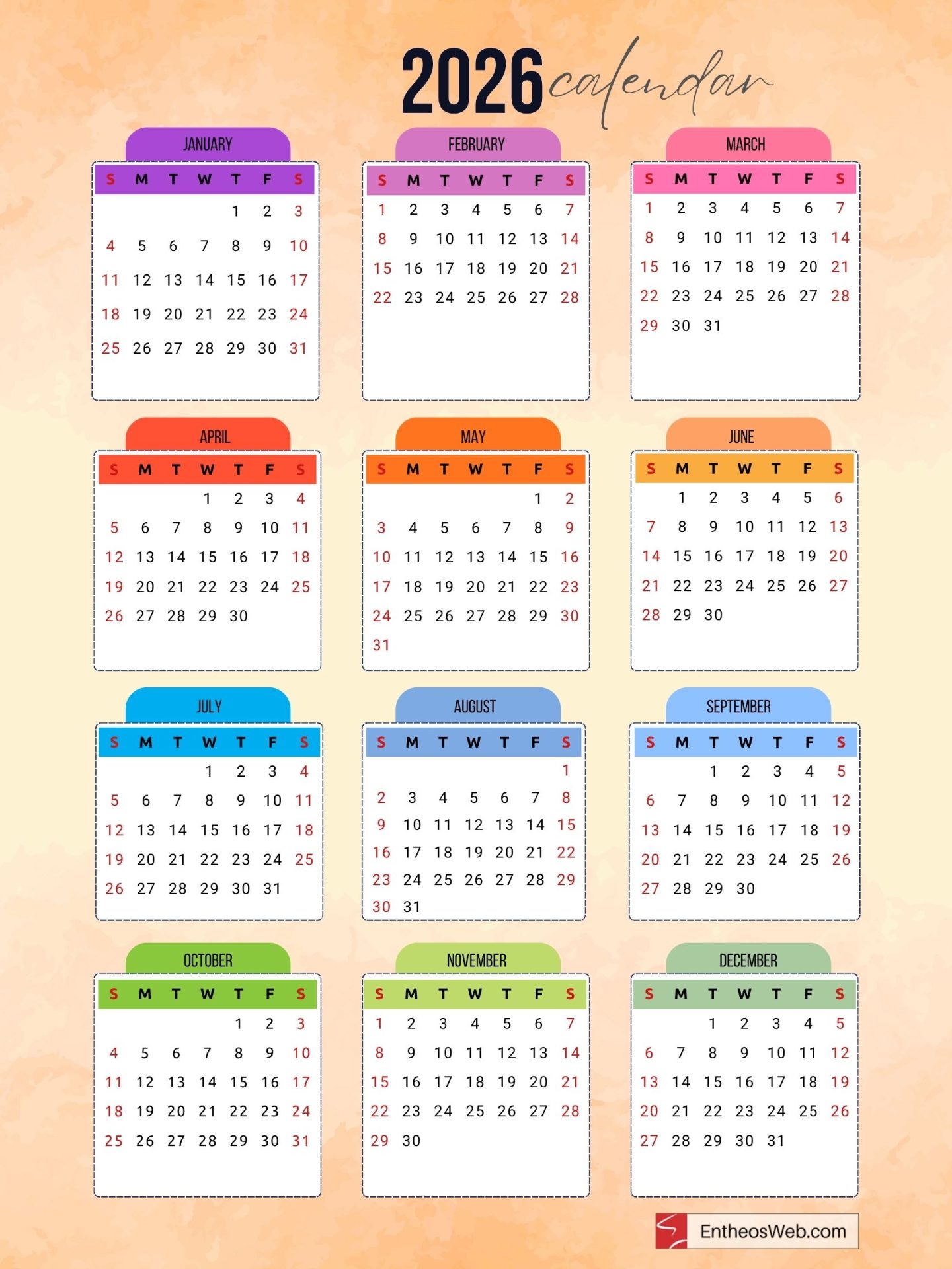 Colorful 2026 Cute Printable Yearly Calendar