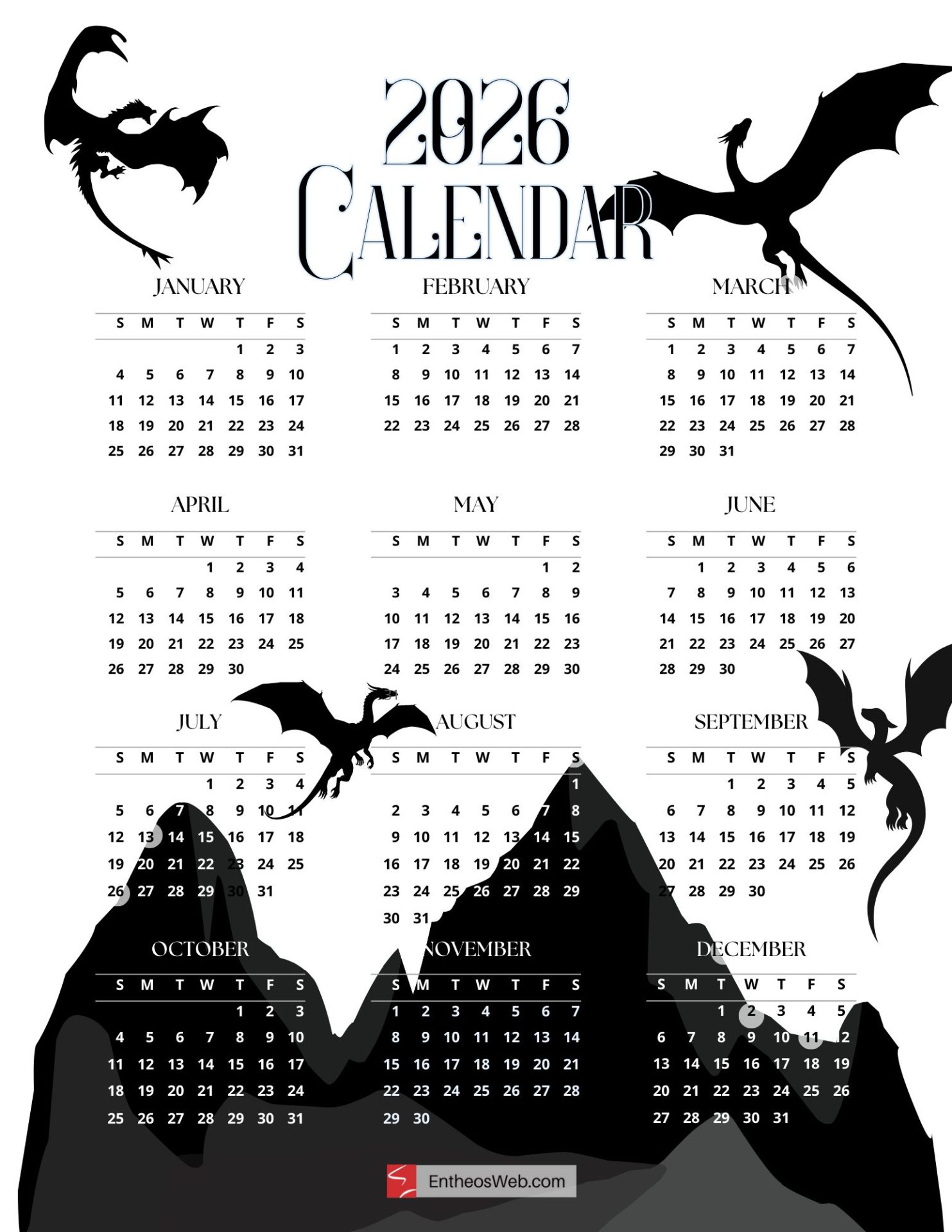2026 Printable Calendars for each Month
