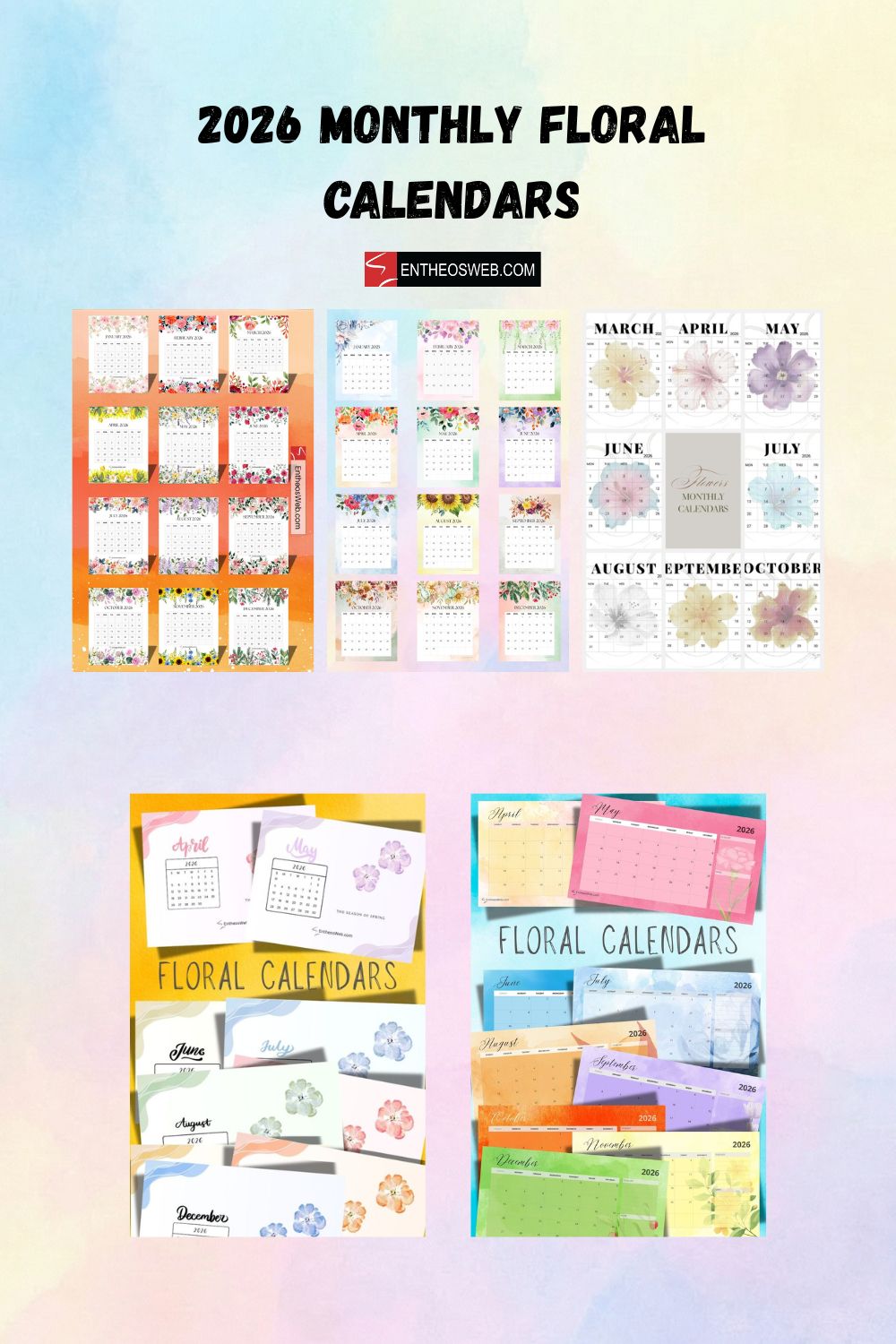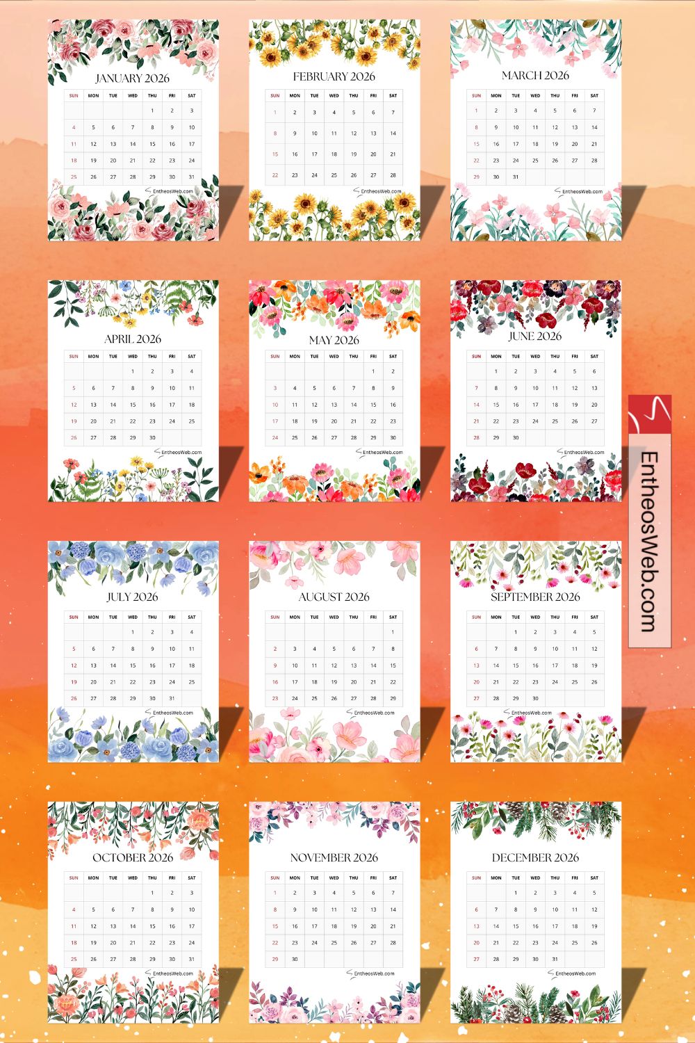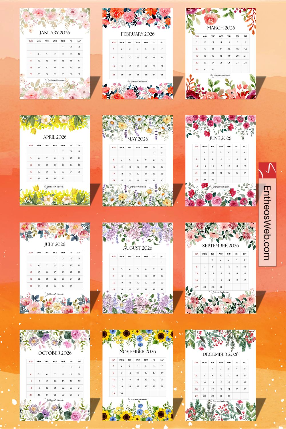 Enjoy a year full of blooms with 4 different sets of our 2026 Monthly Floral Calendar, featuring four beautifully designed calendar sets to choose from. Each set offers a unique floral style, giving you plenty of options to match your mood, décor, or planning needs. Perfect for home, office, or gifting, these printable calendars combine elegance and functionality for all of 2026.