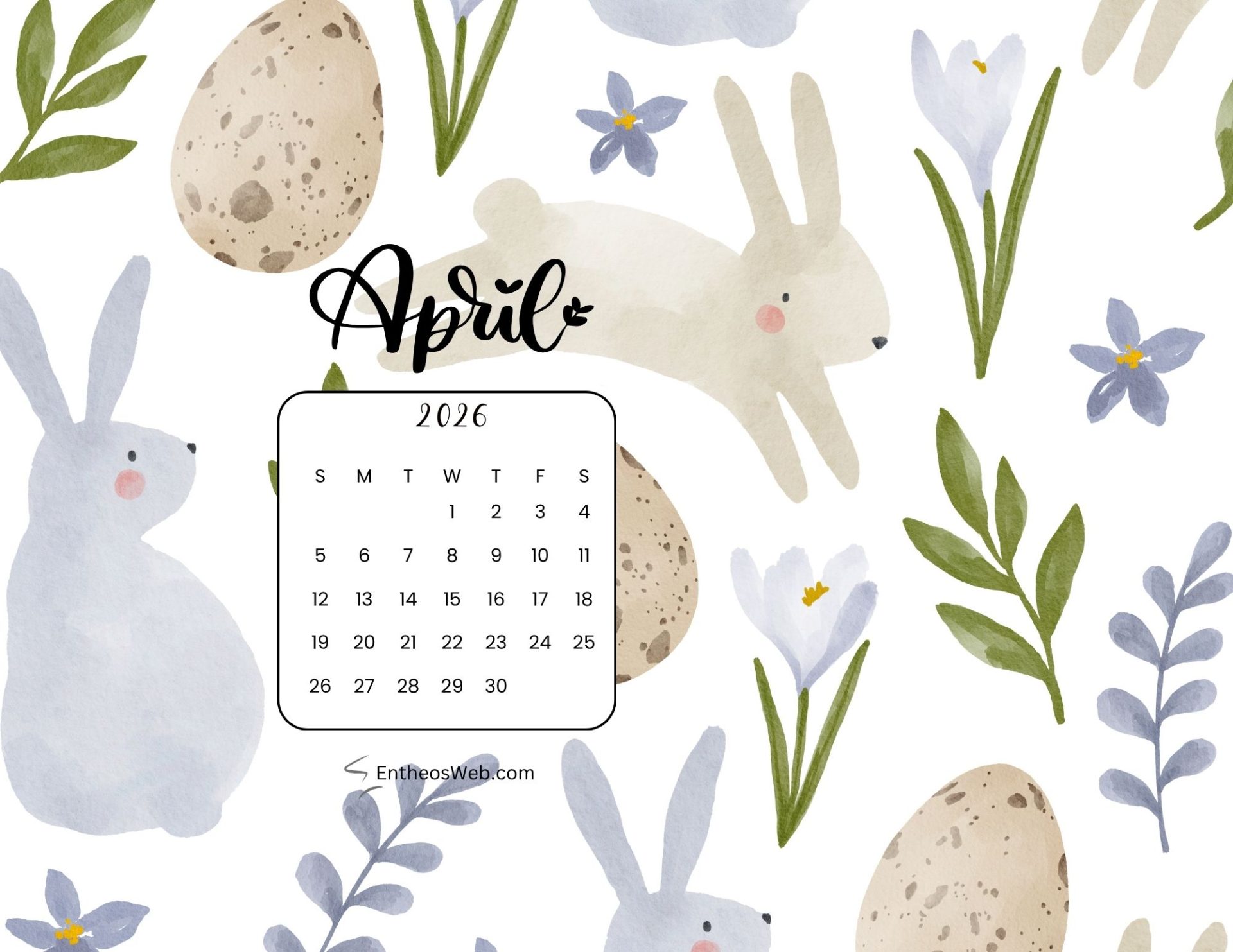 Easter Calendar Designs for April with creative Easter typography design, Easter eggs, rabbits and chicks.