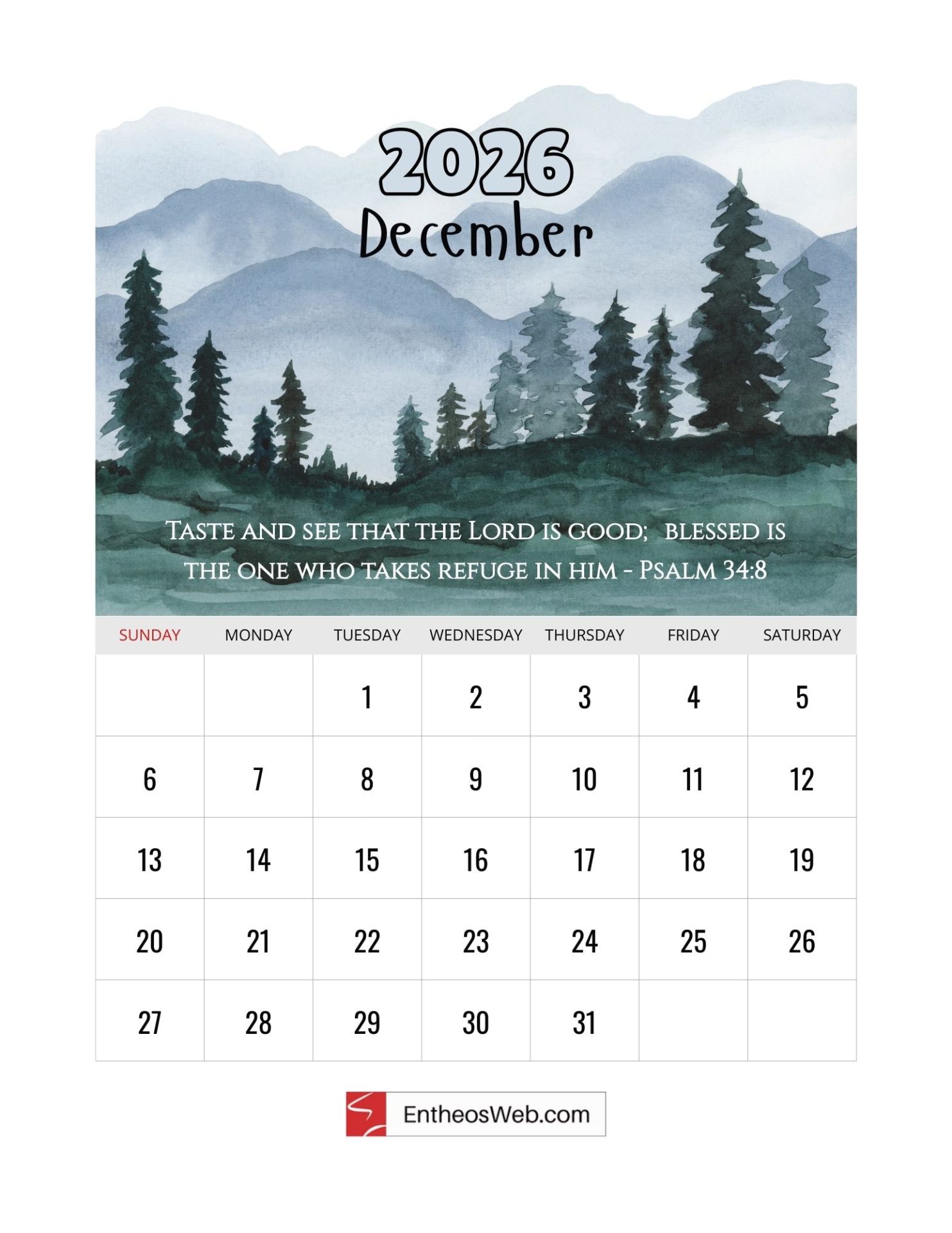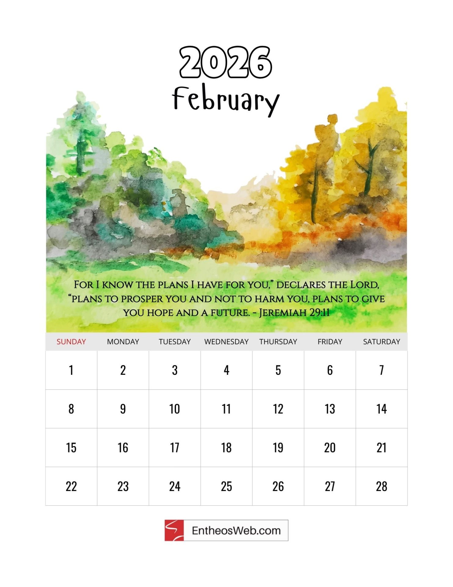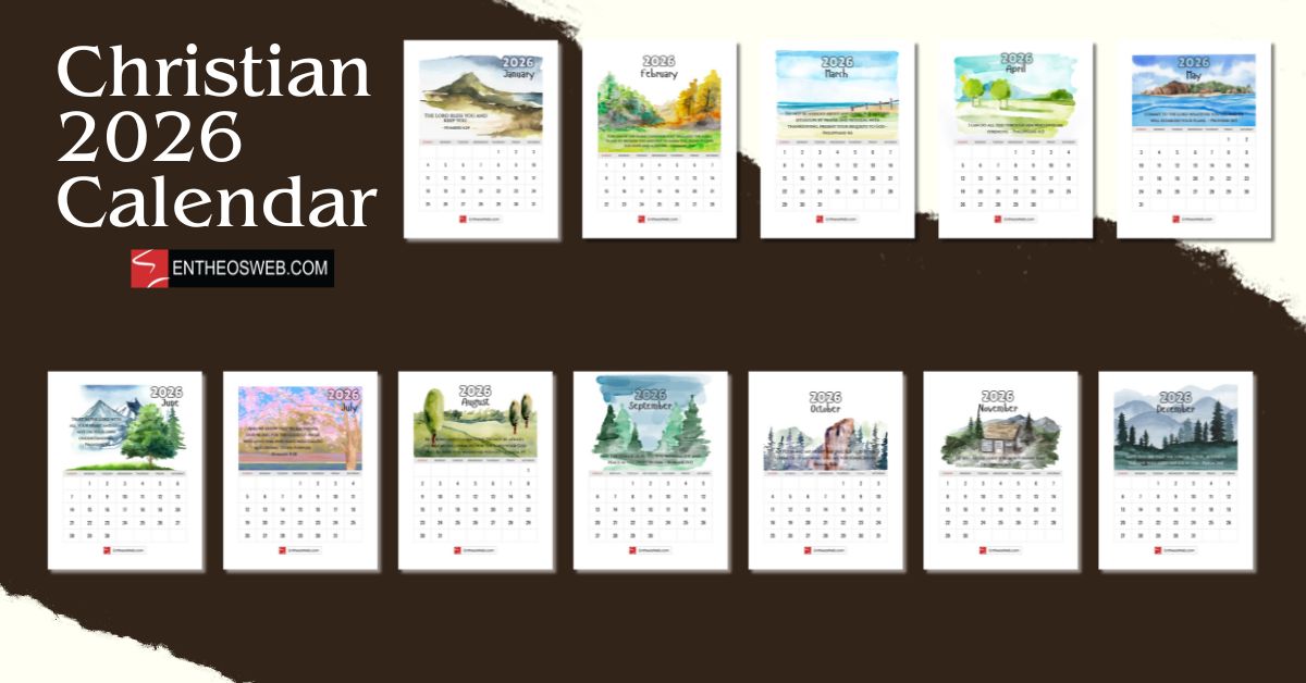 Welcome to our Christian 2026 Calendar, thoughtfully designed to bring inspiration to every month of your year. Each page features a carefully chosen Bible verse paired with a serene watercolor painting of nature and scenic landscapes, creating a peaceful, faith-filled visual experience. Made by EntheosWeb, this free printable calendar is perfect for reflection, encouragement, and adding a touch of beauty and scripture to your daily life.