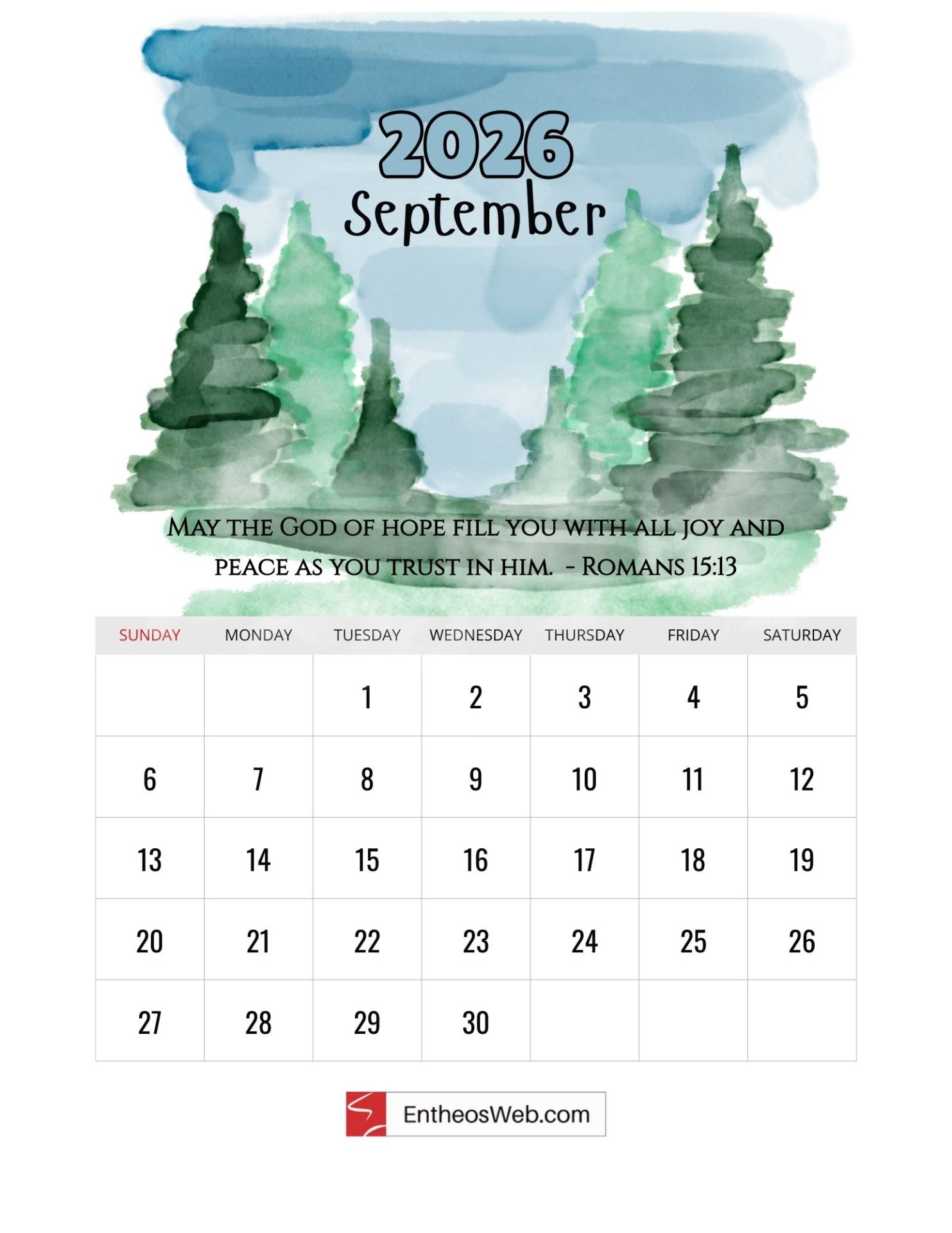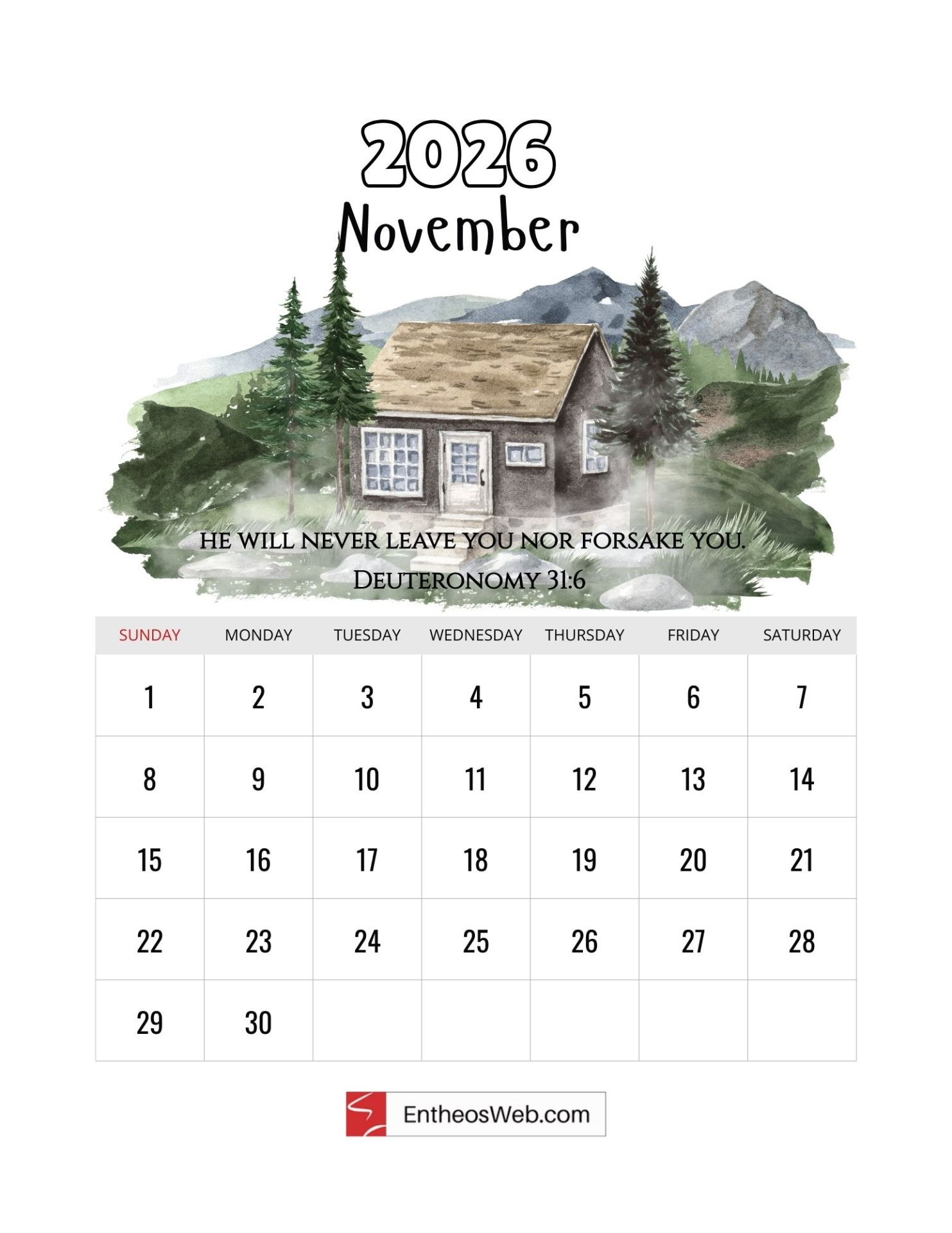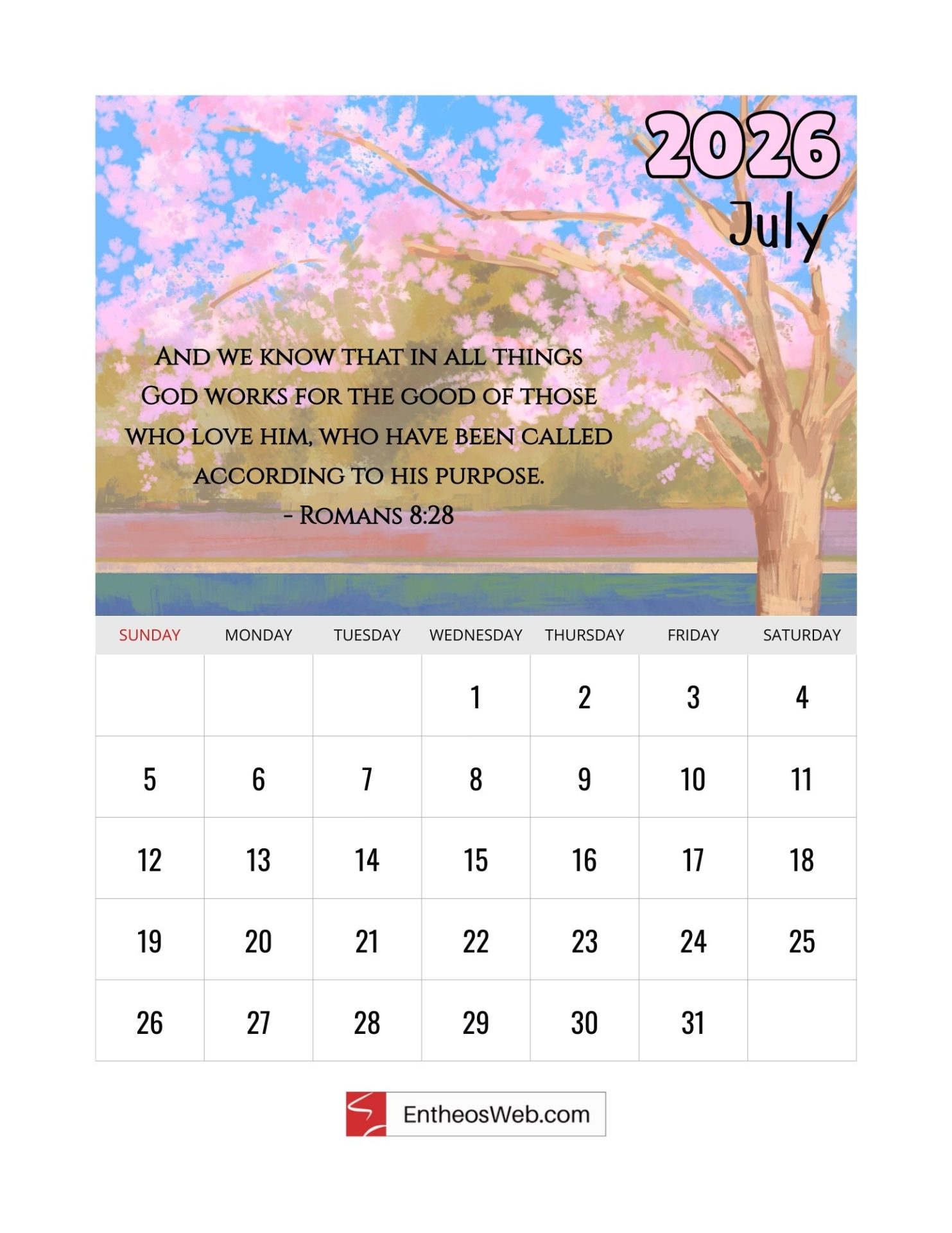 Welcome to our Christian 2026 Calendar, thoughtfully designed to bring inspiration to every month of your year. Each page features a carefully chosen Bible verse paired with a serene watercolor painting of nature and scenic landscapes, creating a peaceful, faith-filled visual experience. Made by EntheosWeb, this free printable calendar is perfect for reflection, encouragement, and adding a touch of beauty and scripture to your daily life.