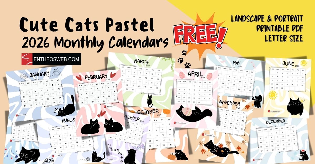 Discover our adorable Cute Cats Pastel 2026 Monthly Calendar collection, lovingly designed by EntheosWeb and available for free download! These charming calendars come in both landscape and portrait layouts (11 x 8.5 inches), featuring sweet pastel themes, playful kitten illustrations. Perfect for homes, offices, planners, or gifting to fellow cat lovers, each month brings a new delightful feline companion to brighten your day. Stay organized in style all year long with these cute and cheerful printable 2026 cat calendars!