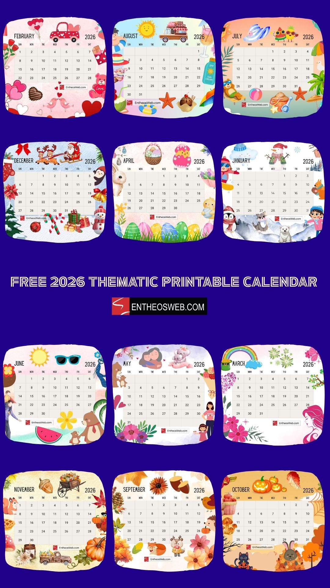 Download our free 2026 Thematic Printable Calendar for each month. These calendars have been creatively designed for each month according to seasons and special occasions like New Year, Women’s Day, Easter, Mother’s Day, Father’s Day, Thanksgiving, Christmas and more!