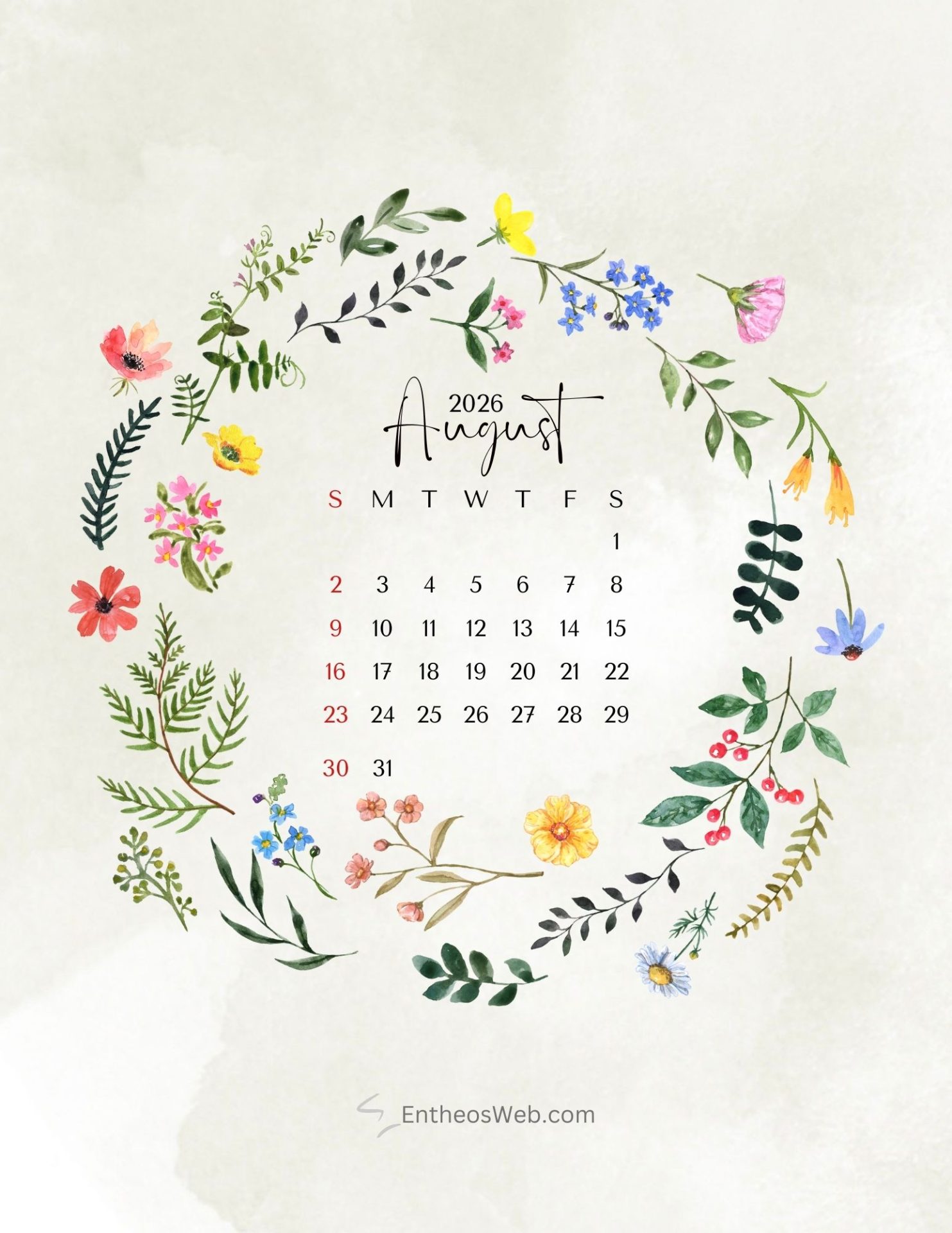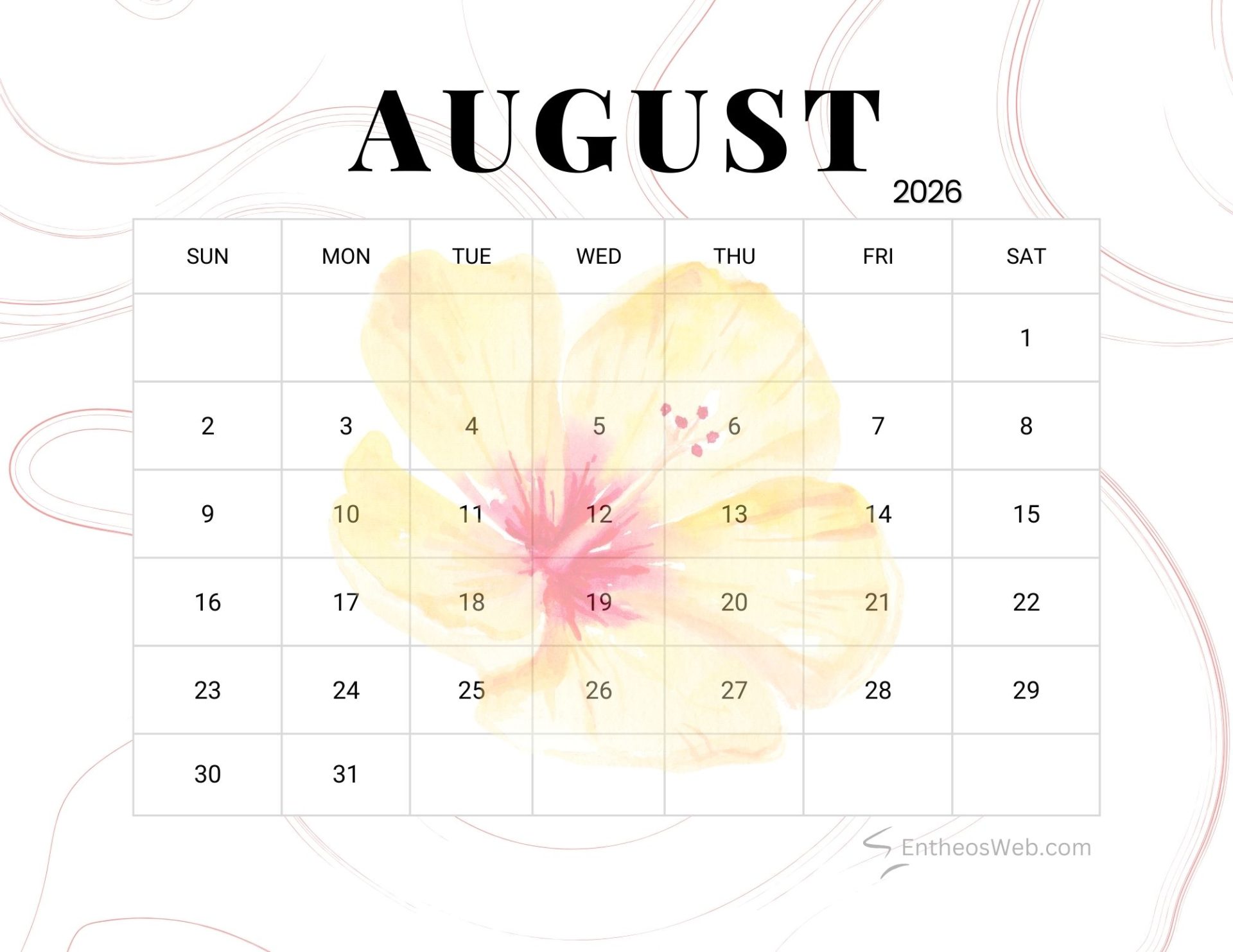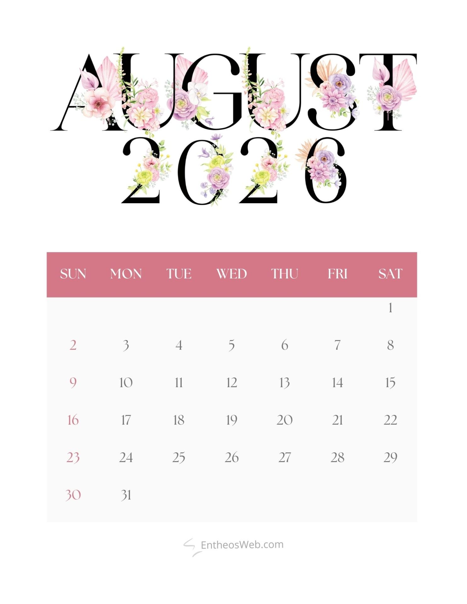 Stay organized and plan ahead with our beautifully designed free printable August 2026 calendars, available in convenient letter-size formats. This web page offers a collection of printable PDF and JPG calendar images, crafted by EntheosWeb, that you can easily download and use at home, in the office, or for personal projects. Whether you need a calendar for scheduling, tracking important dates, or simply adding a stylish touch to your workspace, these free printable calendars are both practical and visually appealing. Download your favorite design today and enjoy a simple, functional, and elegant way to manage your month.