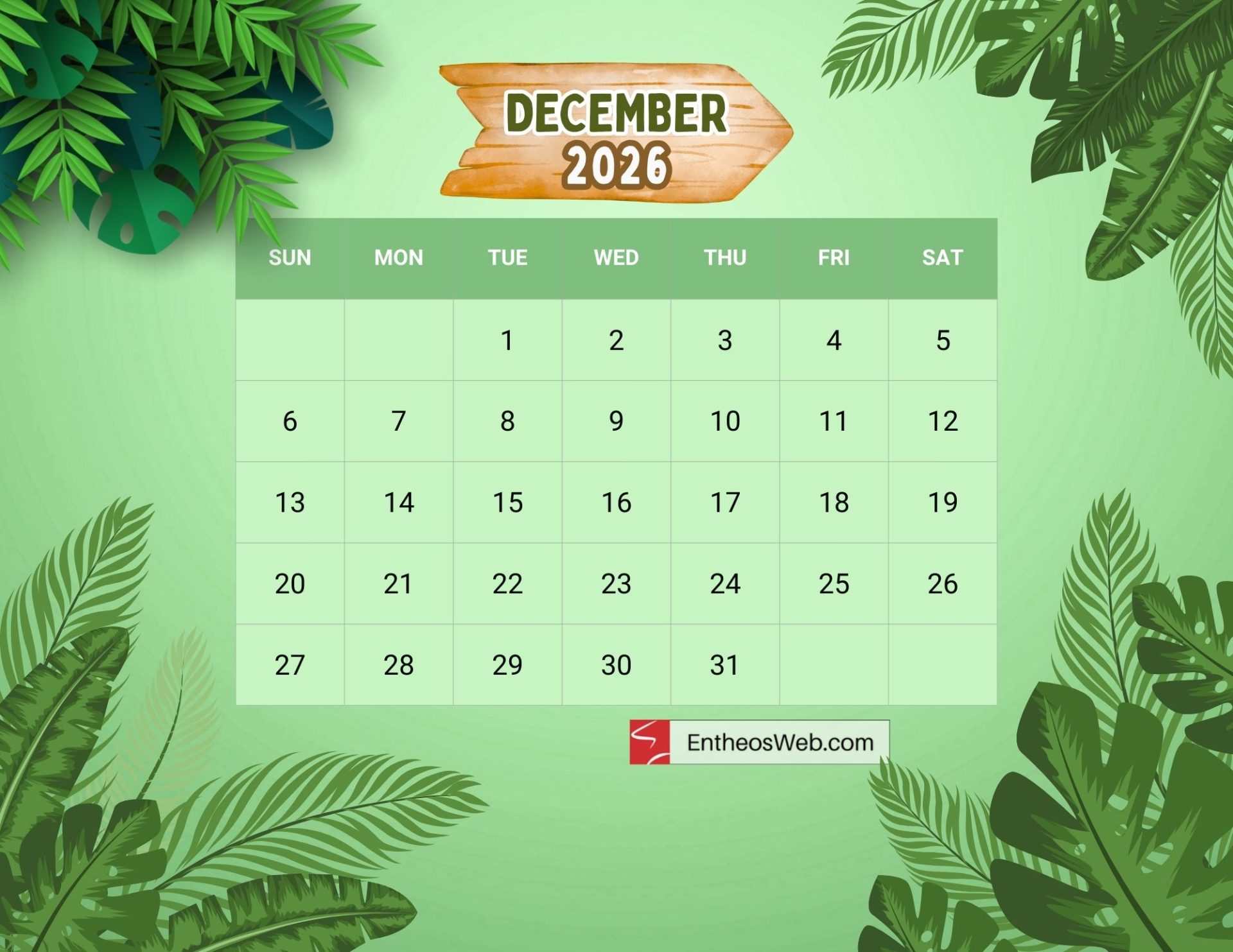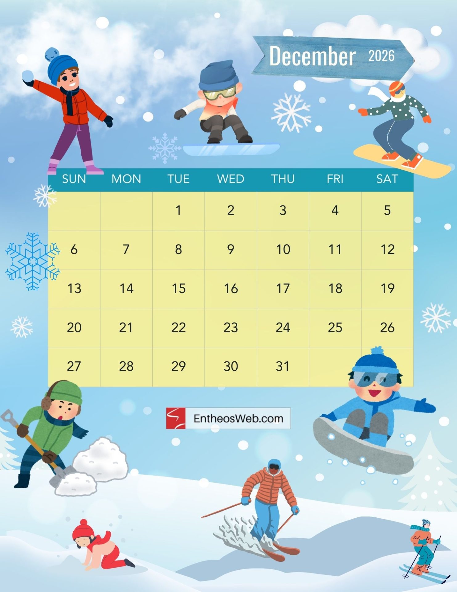 Stay organized this festive season with our beautifully designed December Free Printable 2026 calendars, available in convenient letter-size printable PDF and JPG formats. Created by EntheosWeb, these free calendars are perfect for planning your holiday activities, work schedules, and year-end events. Whether you want to print them out for your desk, pin them on your wall, or save them digitally for easy access, our December 2026 calendars combine style and functionality to help you manage your time with ease. Download your free copy today and make the most of the last month of the year!