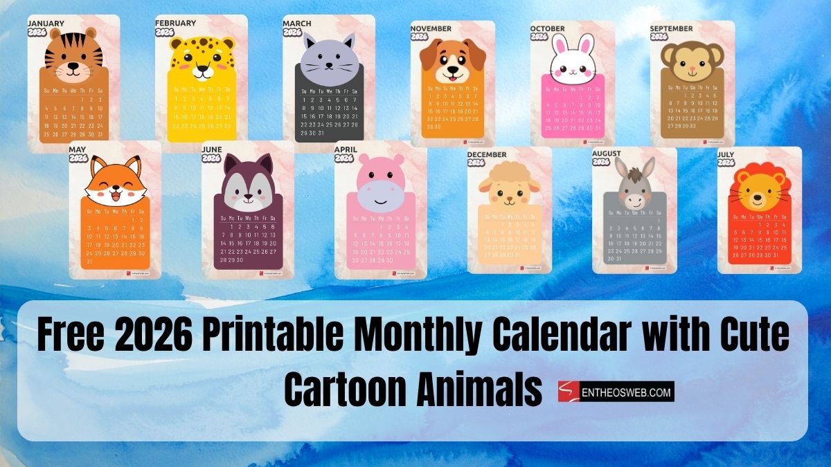 Download our Free 2026 Printable Monthly Calendar with Cute Cartoon Animals. Each month features cute and colorful animal illustrations that make planning fun and engaging for kids and families. Perfect for tracking school events, birthdays, and daily activities, this printable calendar adds a cheerful touch to your routine. Check out our Cute Yearly 2026 Printable Calendars.