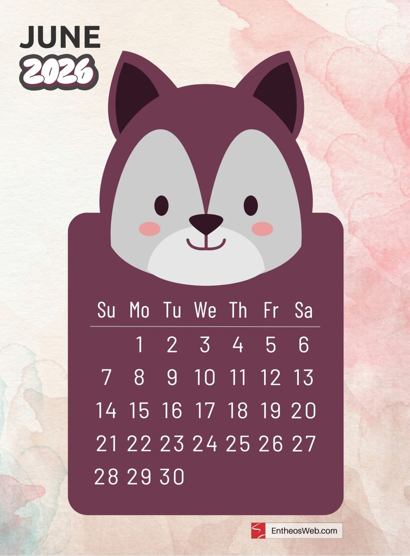 June Free 2026 Printable Monthly Calendar with Cute Cartoon Animal Wolf Dog