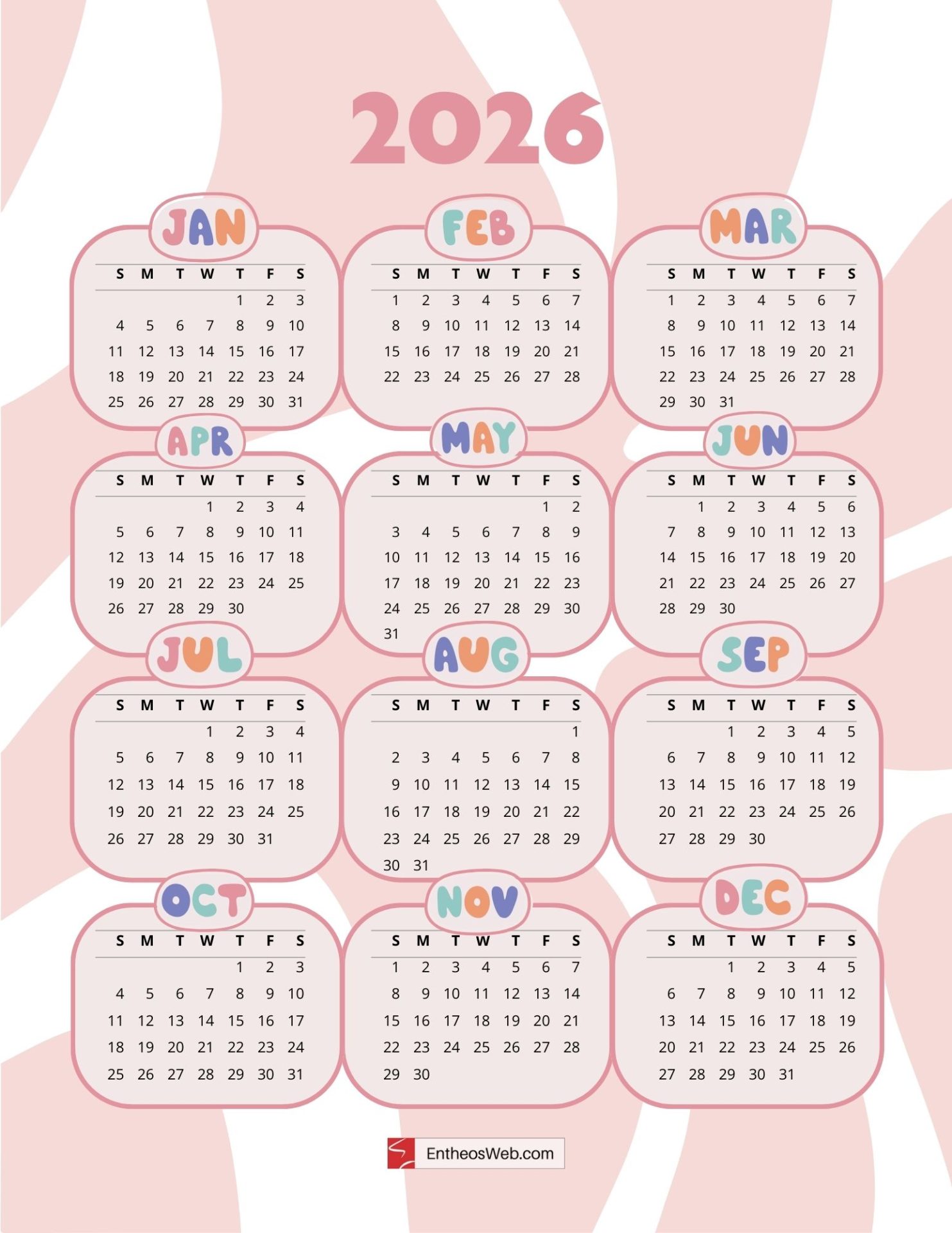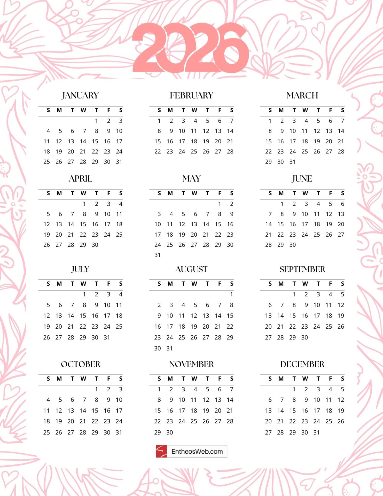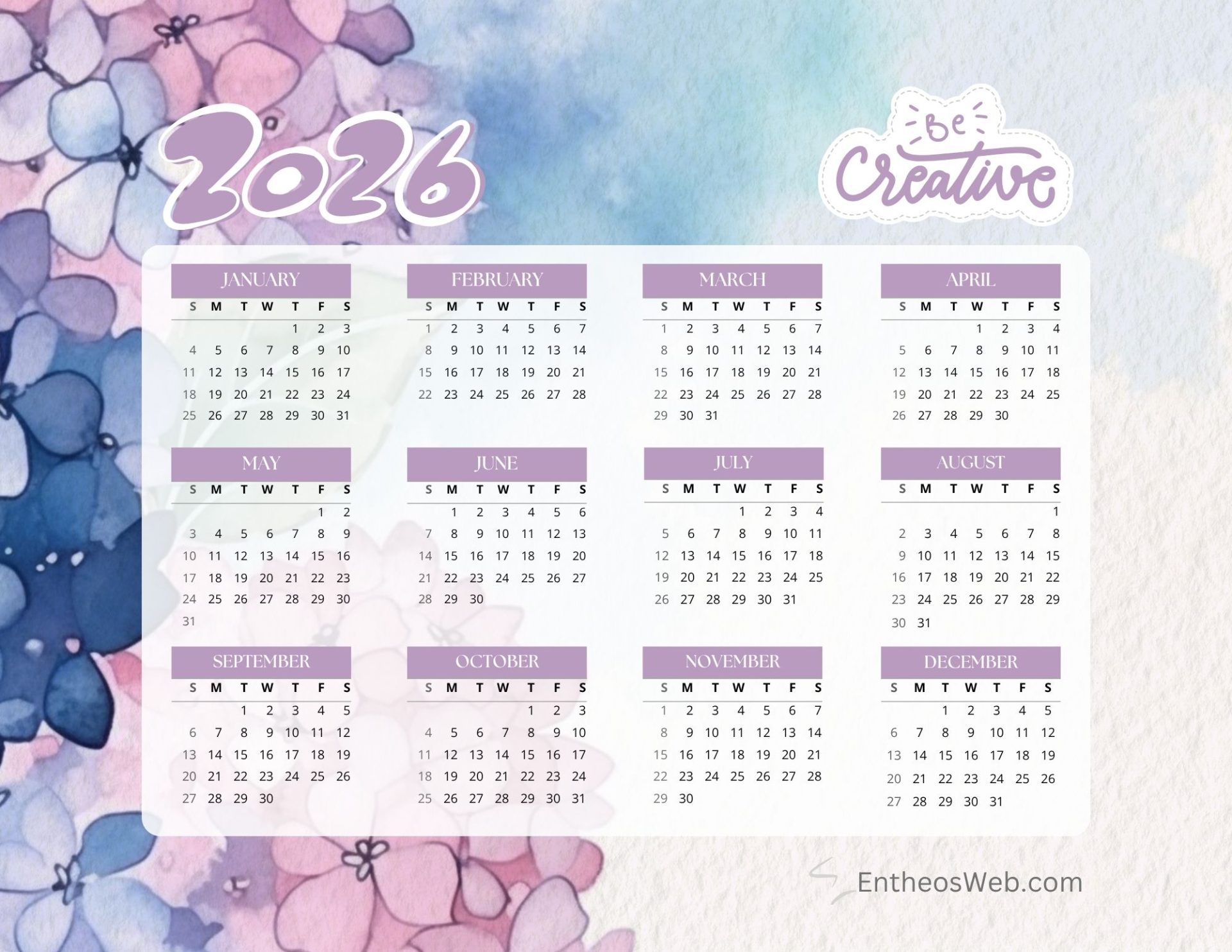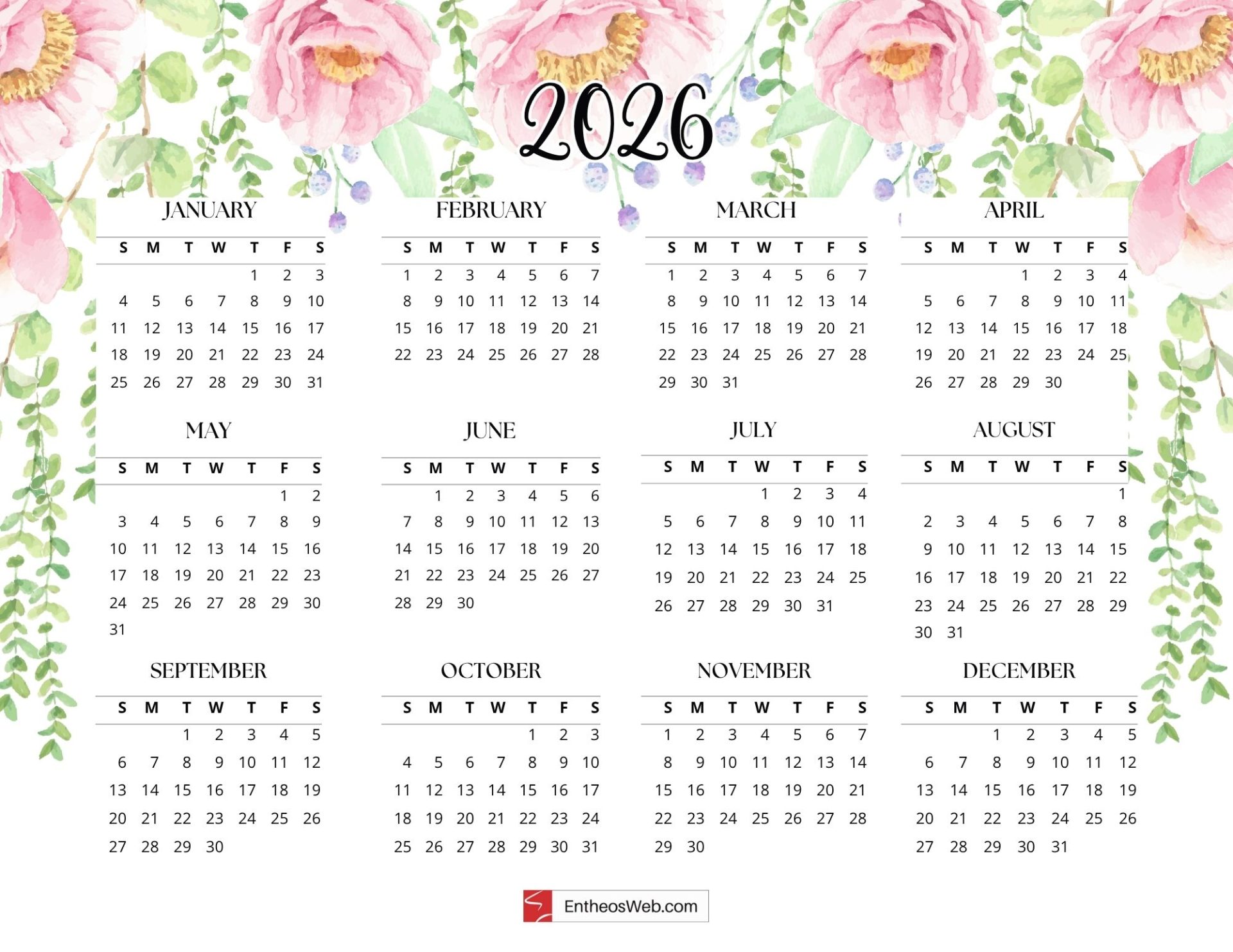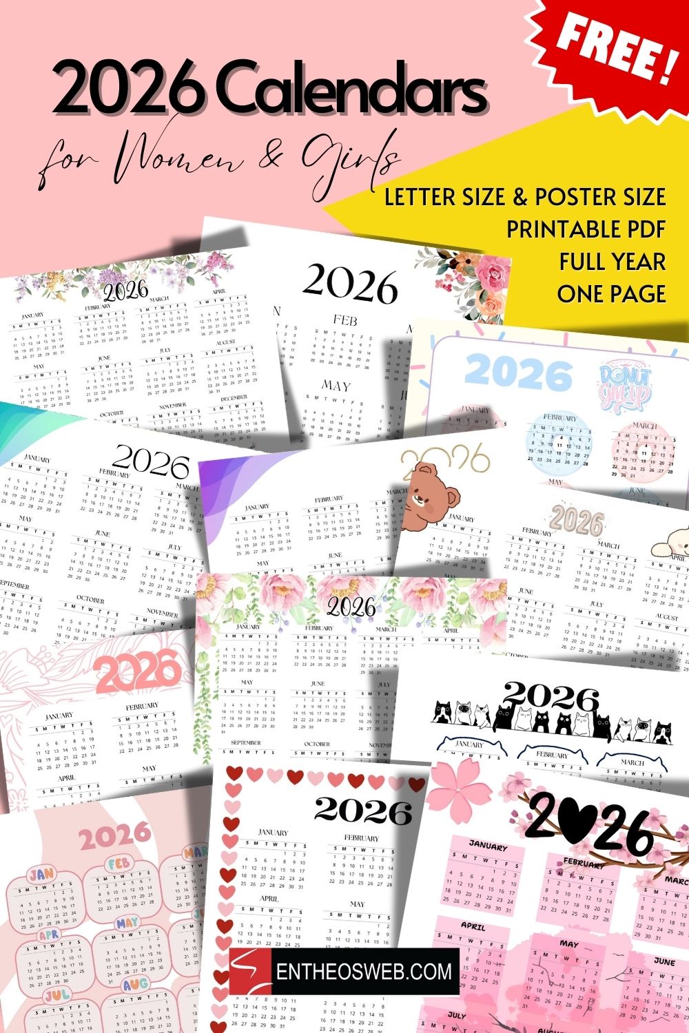 Discover a charming collection of Full Year 2026 Calendars for Women & Girls, beautifully designed by EntheosWeb and available as a single-page printable for easy use. Featuring feminine themes, elegant colors, and inspiring layouts, these one-page calendars are available in Letter size and Poster size and are perfect for planners, home organization, study desks, or office walls. Enjoy a stylish and practical way to plan your year—free to download and print in JPG and PDF formats that bring both beauty and functionality to your daily scheduling.