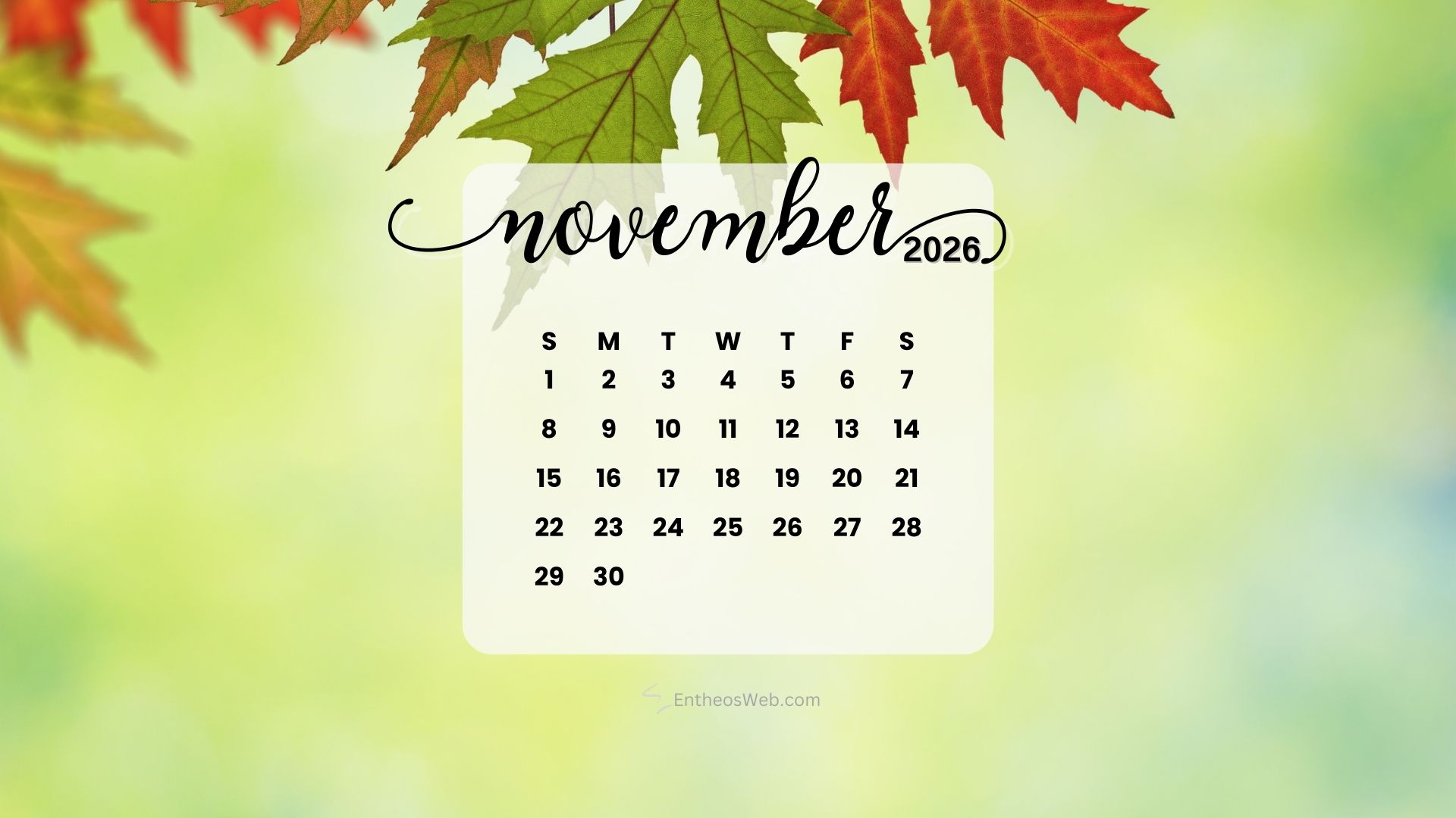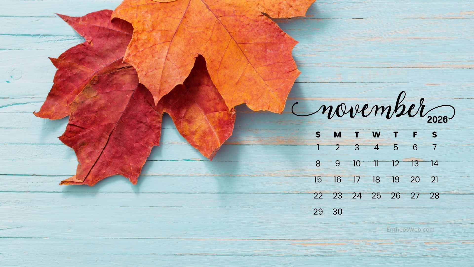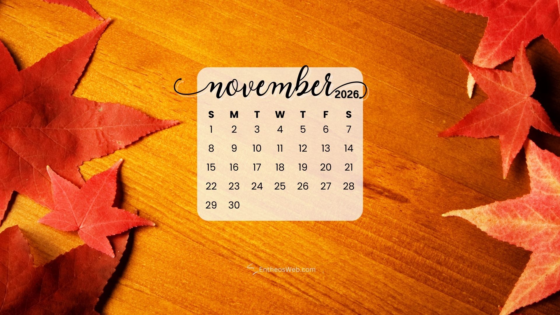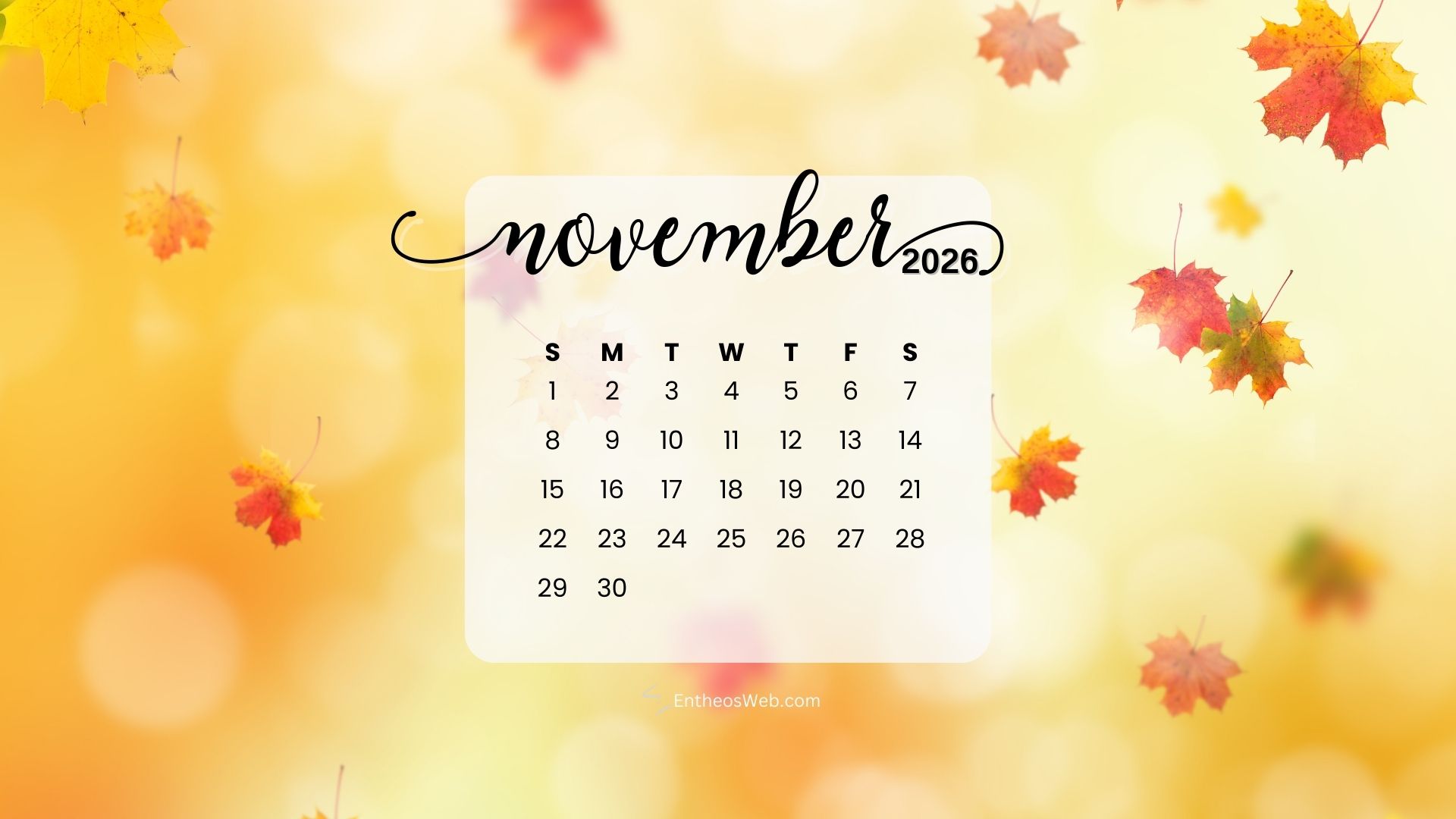 Stay organized this fall with the November 2026 Desktop Wallpaper Calendar. Featuring a clean and easy-to-read monthly layout, this desktop background helps you keep track of important dates, events, and plans at a glance. Perfect for home or office use, it adds a seasonal touch while keeping your schedule front and center throughout November 2026.