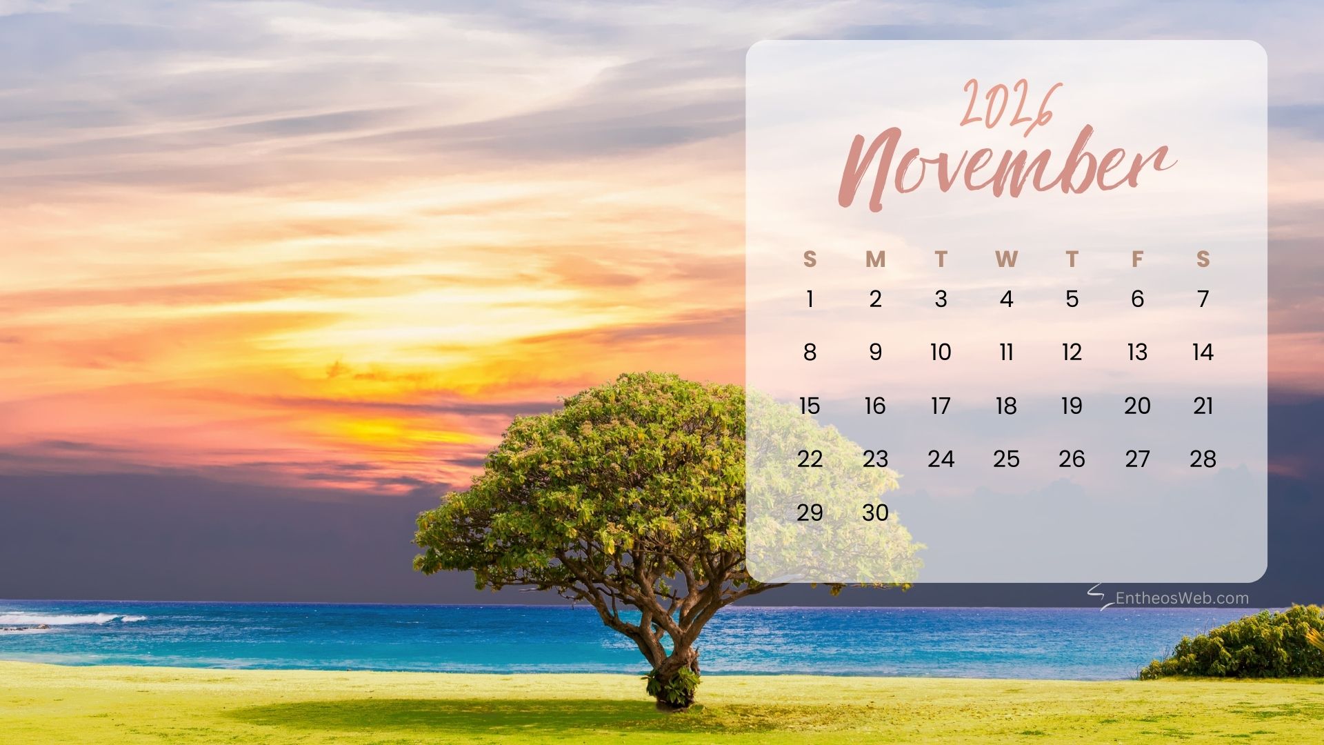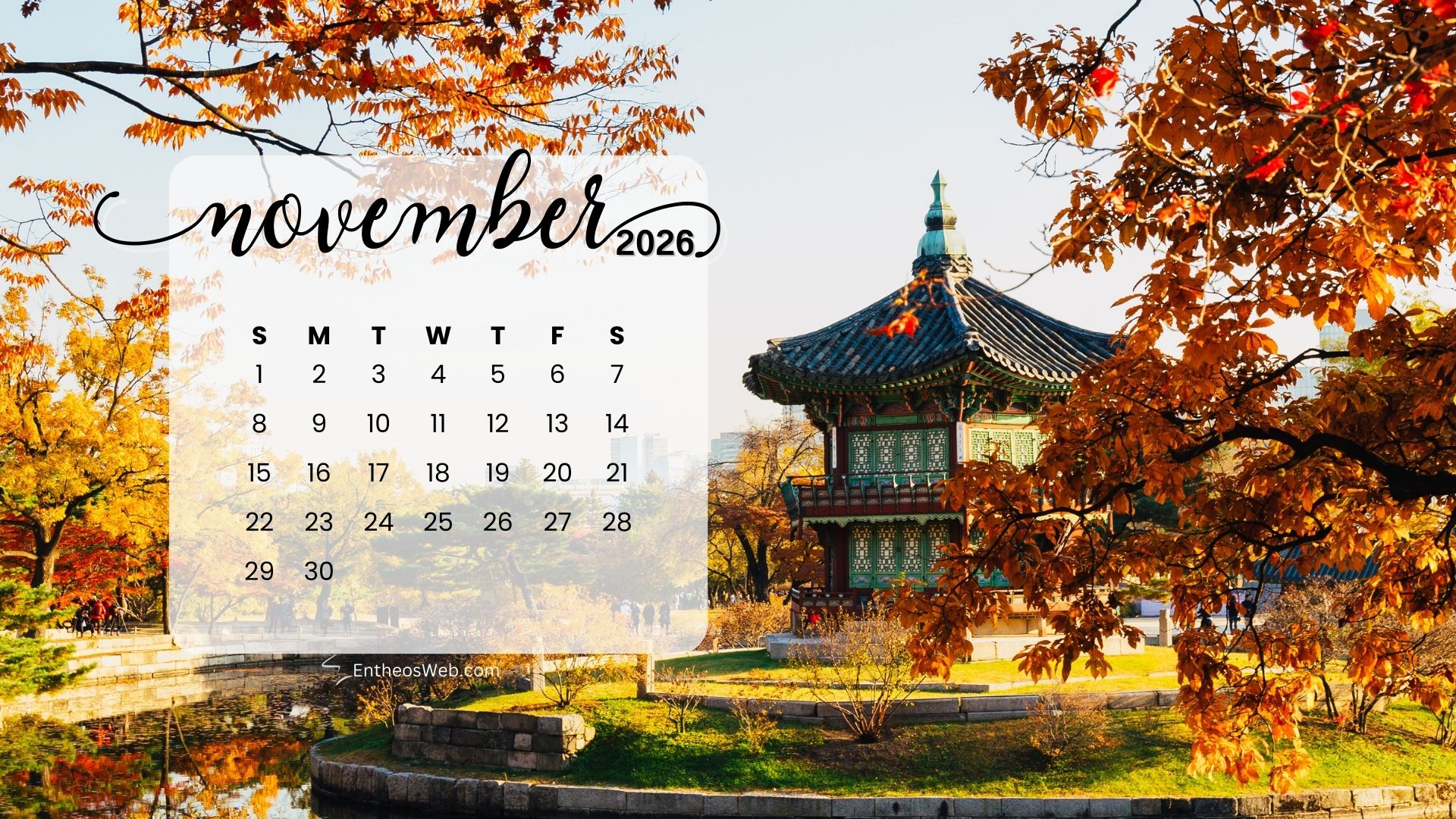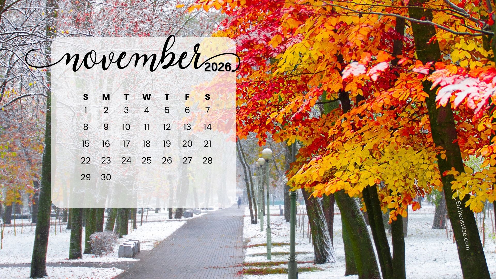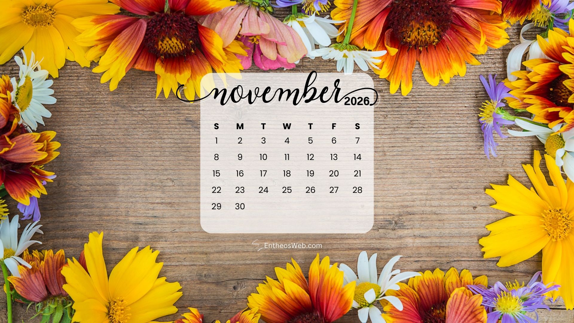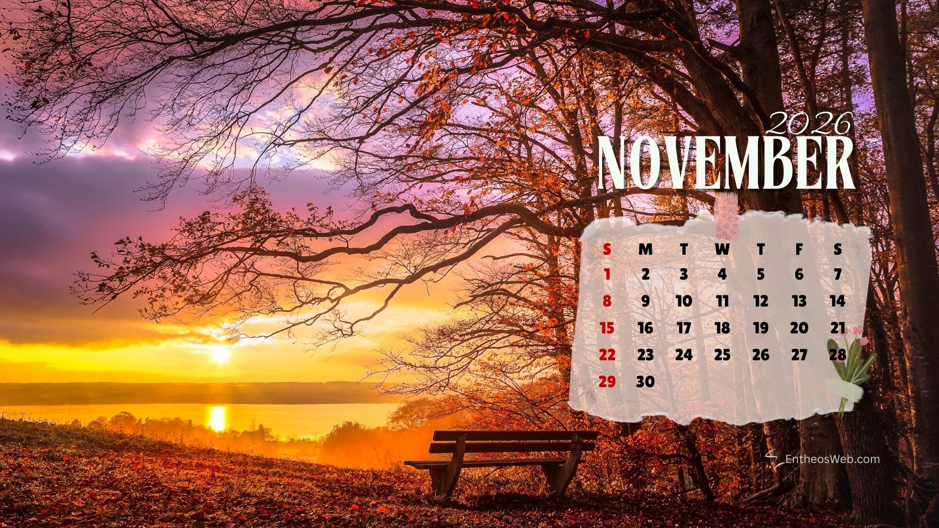 Stay organized this fall with the November 2026 Desktop Wallpaper Calendar. Featuring a clean and easy-to-read monthly layout, this desktop background helps you keep track of important dates, events, and plans at a glance. Perfect for home or office use, it adds a seasonal touch while keeping your schedule front and center throughout November 2026.