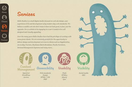 Hello Studios uses hand drawn design elements in their icons, tag lines and images.