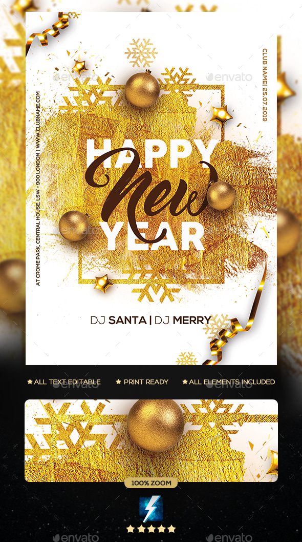 New Year flyers, poster designs for New Years party. All elements are in individual layers and all text is editable. Easy to customize & edit.