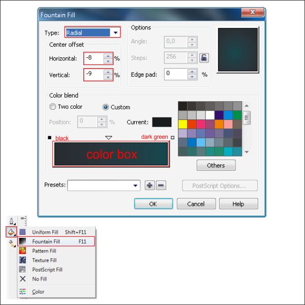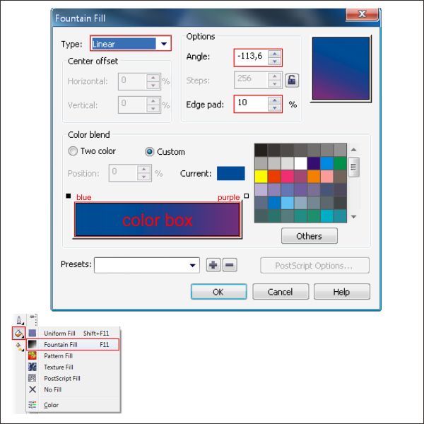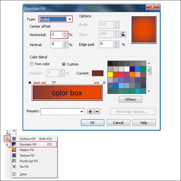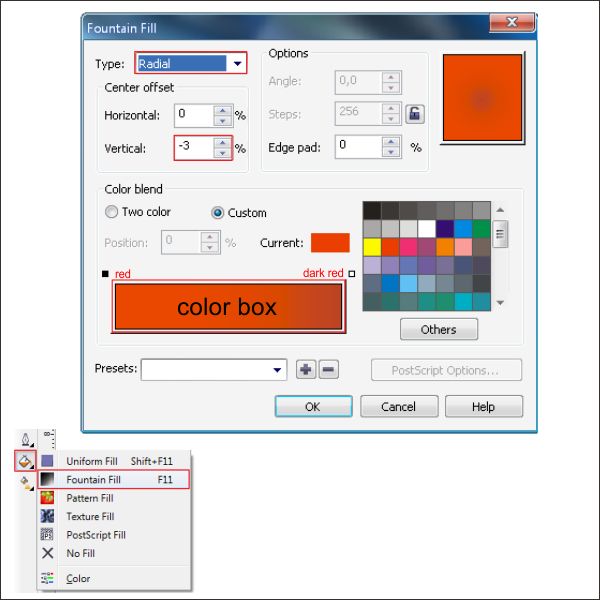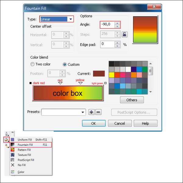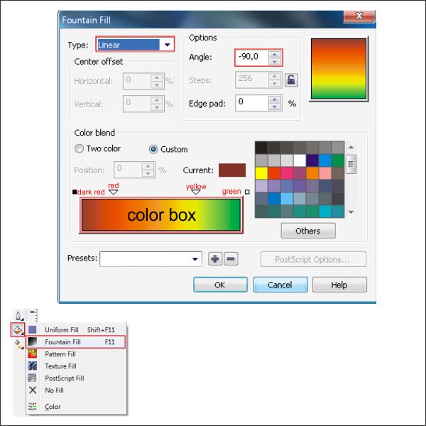 Okay now lets put color on the lines by go to the ” Fountain Fill Tool ” and apply the value below, in this case i use red combination but you can add color that you like.