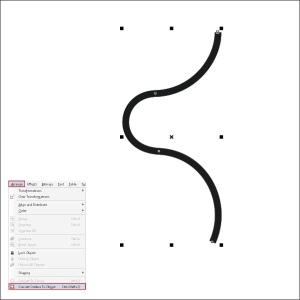 After that go to the upper toolbar and find Arrange > Convert Outline to object, this will convert the line into object so we can customize it.
