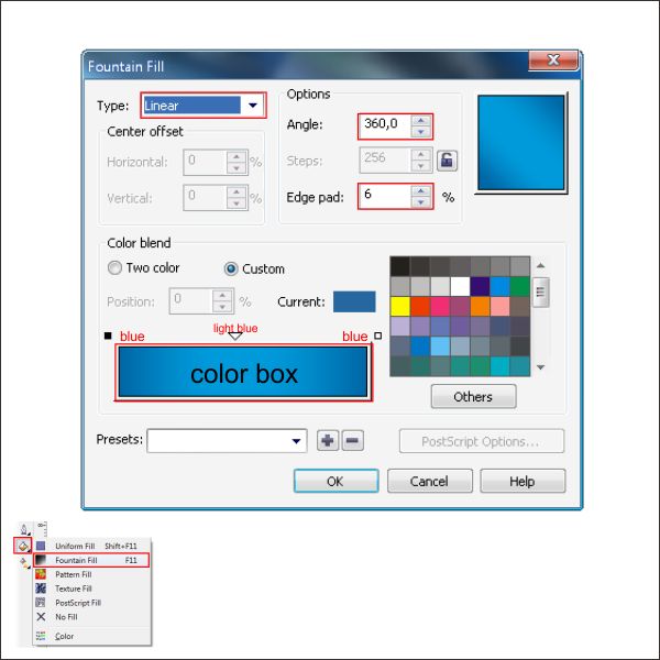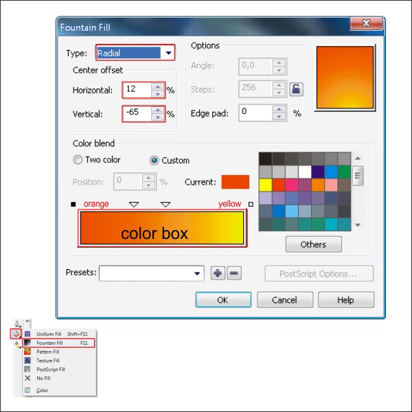 Now select the outer shape and put a color in it by go to the ” Fountain Fill ” tool in the left toolbar and apply the value below.