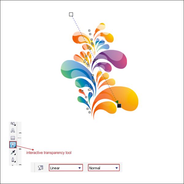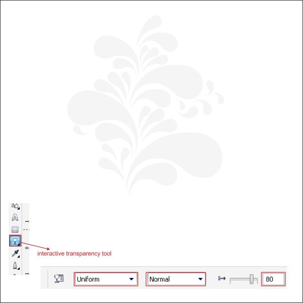 Select the copied elements, put a white color in it, and go to the ” Interactive Transparency Tool ” in the left toolbar, now you see that the cursor are changing into glass, drag it from top to the right bottom corner of the elements to make it transparent.