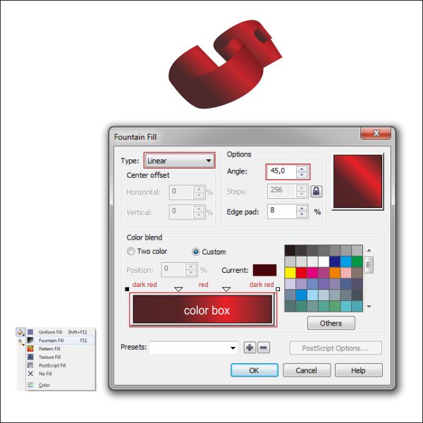 Now you will see a color box. You can change the color by left-clicking it, fill the color with Dark Red on the left, Red in the middle and Dark Red on the right.