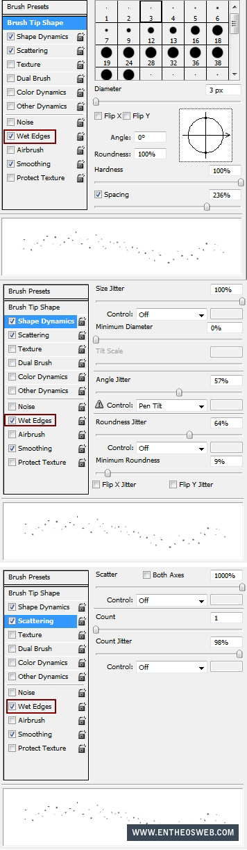 In some next steps I’ll show you how to make realistic rain drops. Make a new layer on the top and set foreground color to white. Hit B to active Brush tool, choose size with 3 px then press F5 to make settings of this brush as shown below: