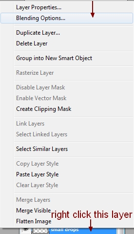 Name it “small drops”. Right click this layer, choose Blending Options: