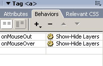 Step 7 : The behavior and action is displayed. You have to change the ‘onClick’ to ‘onMouseOver’. Click on the option and select ‘onMouseOver‘ behavior. In the next row add another behavior ‘onMouseOut‘ and follow the same step as before to open the Show-Hide Layer and click on ‘hide’ to the same layer. What happens now is when you move the mouse over the link the image is viewed and when the mouse is moved out of the link the image is hidden.